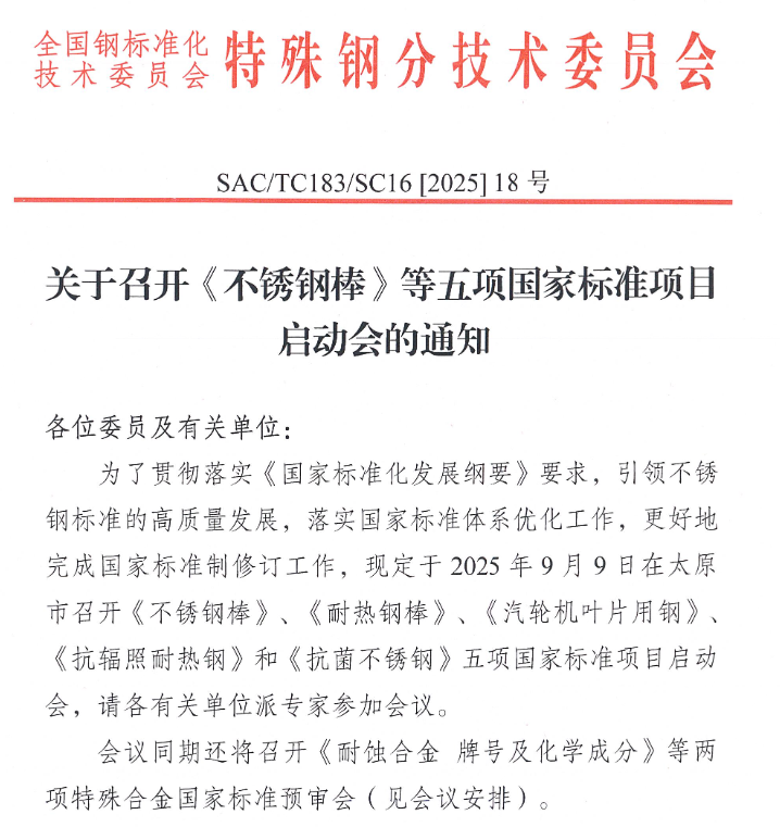 2025年9月9日,《不銹鋼棒》、《耐熱鋼棒》、《汽輪機葉片用鋼》、《抗輻照耐熱鋼》和《抗菌不銹鋼》五項國家標準項目啟動會將于太原市召開。