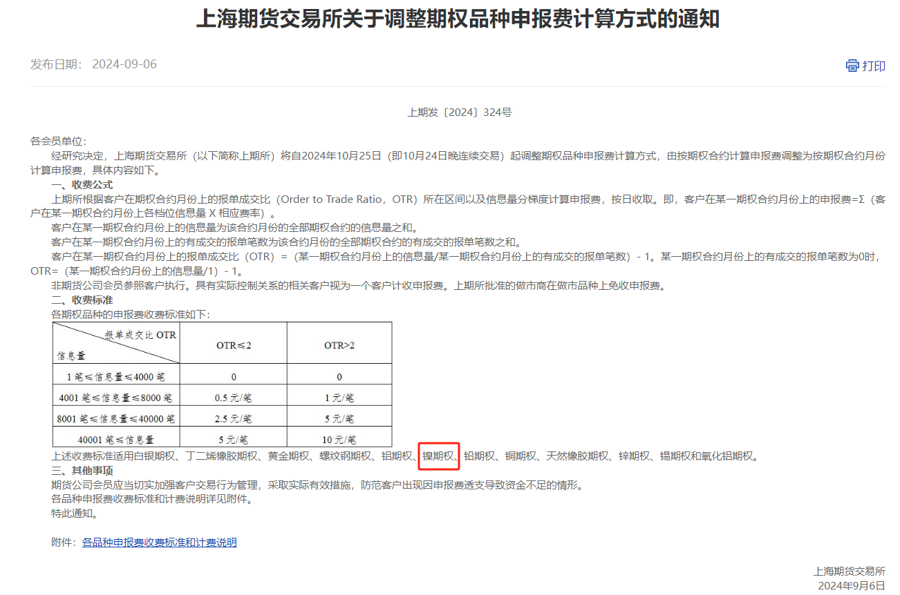 據顯示,鎳期權申報費將自2024年10月25日(即10月24日晚連續交易)起調整。