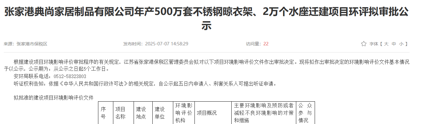 2025年7月7日,張家港典尚家居制品有限公司年產500萬套不銹鋼晾衣架、2萬個水座遷建項目環評獲審批公示,公示期:5個工作日。