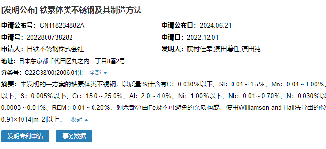 2024年6月21日,日鐵不銹鋼株式會社成功申請“鐵素體類不銹鋼及其制造方法”專利,申請公布號CN118234882A,申請日期為2022年12月1日。